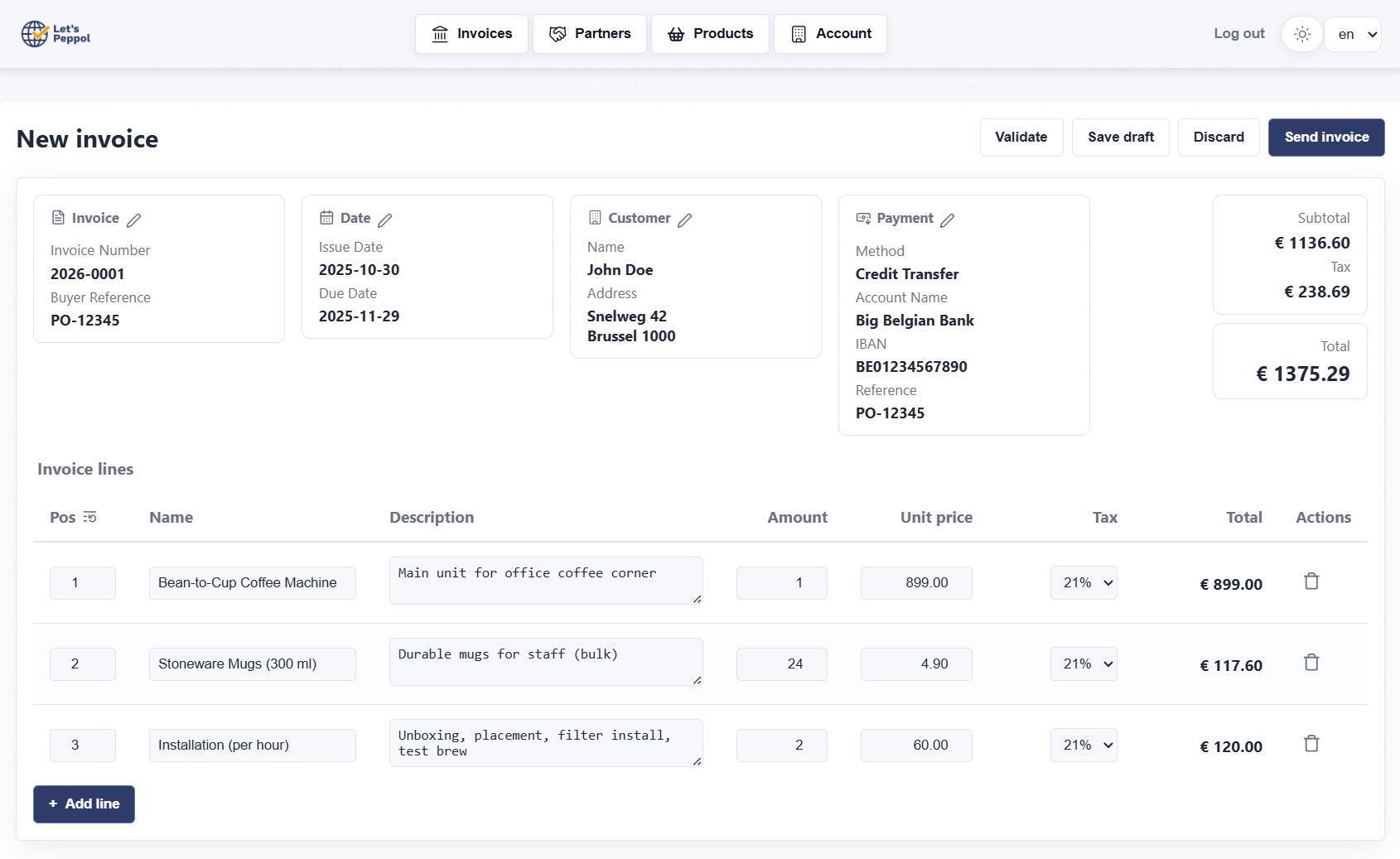 Let's Peppol is a free, open‑source access point backed by Belgian non‑profit BARGE vzw. Send & receive e‑invoices over the Peppol network with an inbox that feels like email.